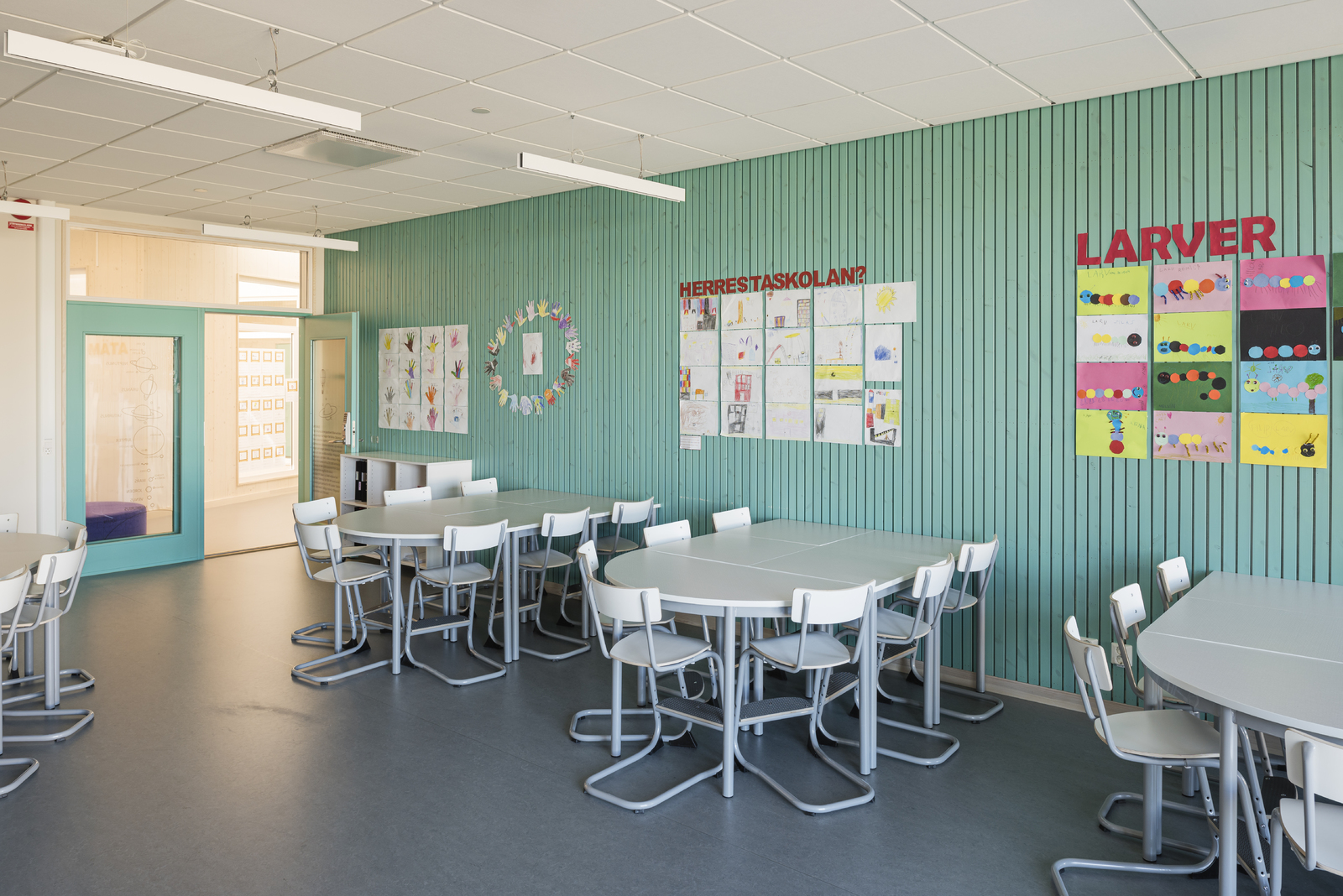 Herrestaskolan i Järfälla kommer att bli Sveriges första skola med miljöcertifieringen Guld. Interiörpanelen är PEFC-certifierad Trend Furu som är laserad i olika kulörer vilket ger varje rum en unik känsla och karaktär.