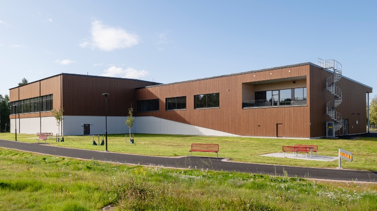 Fasaden är utförd i infärgad, värmebehandlad träpanel som med tiden kommer att bli ännu mer livfull och uttrycksfull