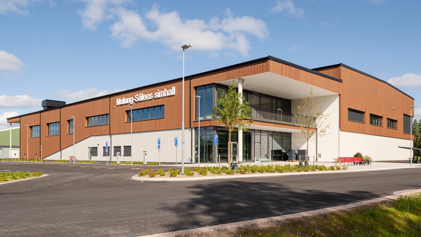 Med ThermoWood BT Pigment i kulörerna Mahogny brun och Vit har Malung Simhall ett naturligt varmt uttryck. Genom att kombinera ThermoWood i två olika profiler har arkitekten skapat känslan av en extra bred panel som samtidigt är intressant på nära håll. Fasaderna är brandskyddade enligt SP FIRE 105 med bruksklass EN16755.