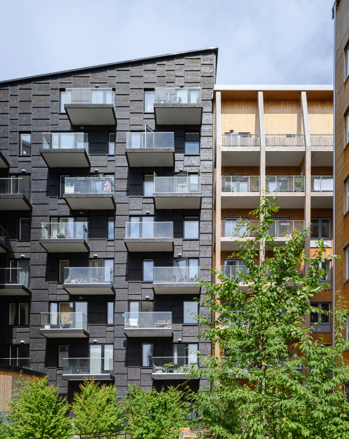 Moelven har levererat ThermoWood som är brandskyddad och infärgad i kulör svart. Vi har även levererat ofärgad panel som kommer att patineras och gråna.