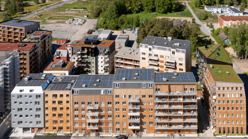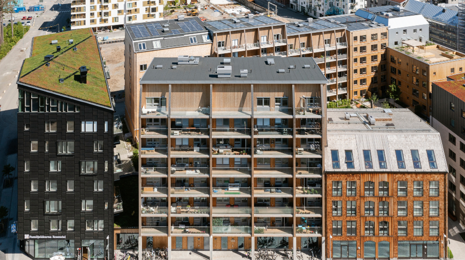 Talltorget i Rosendal är en ny stadsdel i Uppsala. Rosendal A1 består av flera huskroppar och fasaderna är beklädda med brandskyddad panel av ThermoWood och cederträ från Moelven. Arkitektens mål var att skapa en känsla av gemenskap tillsammans med stort fokus på miljö och då föll valet på trähus med godkänd träpanel för flervåningshus.